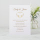This wedding invitation is shown in a classic layout on a White background shown in a paper choice of Peal Shimmer paper. Select your choice paper. Fancy swirl heart graphic in Gold colour. Couple's Names highlighted in a Golden-colour at top. Body text shown in Golden-colour beneath the heart. Customise this item by taking the sample text and putting your information in it instead.
