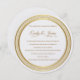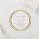This wedding invitation is shown in a round layout on a White background shown in a paper choice of Peal Shimmer paper. Select your choice paper. Gold tone looking trim all around the circle shape envelope Couple's names and text. Shown in Golden-colour. Customise this item by taking the sample text and putting your information in it instead.