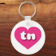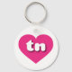 This keychain features a shapely and vibrant hot pink heart containing the bold, rounded, white lower case letters tn, a playful version of the abbreviation for Tennessee, the volunteer state .