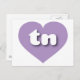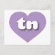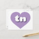 This postcard features a shapely and cool lavender heart containing the bold, white, rounded lower case letters tn, a playful abbreviation for Tennessee, the volunteer state. The reverse side of the postcard is blank, awaiting your customised text or handwritten sentiments.