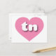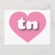 This postcard features a shapely and vibrant pink heart containing the bold, rounded, white lower case letters tn, a playful version of the abbreviation for Tennessee, the volunteer state.