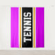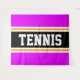 This sporty, athletic design features bold TENNIS text inside a highlighted wide black stripe with double white and yellow racing stripes against bright tropical pink outer stripes. The text in this design can be personalised.