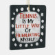 An irreverent typographic design that says "Tennis Is My Little Way Of Humiliating Myself". It features black and red text on a white rectangle with funky, playful white dots surrounding it, all on a dark grey background.