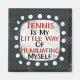An irreverent typographic design that says "Tennis Is My Little Way Of Humiliating Myself". It features black and red text on a white rectangle with funky, playful white dots surrounding it, all on a dark grey background.