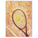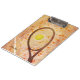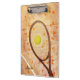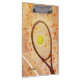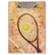 Cute girl's tennis clipboard features an abstract tennis graphics composite with tennis ball and racquet and scattered hearts floating on a breeze over a tennis court - her name is customisable - by katz_d_zynes