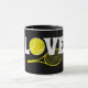 Retro style grunge "Love" text design with yellow tennis ball and racket decoration