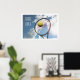 Photograph of of a tennis racket and ball against clouds, blue sky and sunlight. Customizable text, "Tennis Lover."