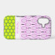 Personalize this pretty iPhone case with a name or other short text. Tennis balls create a bright polka dot pattern, and there is a further pattern of pink tennis rackets on a pale pink background.