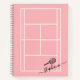 Girly and feminine personalised tennis design notebook with a tennis court outline and custom name in an elegant script calligraphy handwriting font and tennis racket and tennis ball monogram logo. The pink, black, and yellow colours can be customised using the advanced template editor to create a unique and one of a kind gift for the tennis lover, player, teammate, or coach.