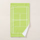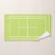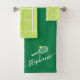 Dark Green and Lime Yellow / Green Personalised bath towel, hand towel, and washcloth set with a simple cute tennis racket graphic and custom name or text in a feminine girly and modern pretty script font monogram, and court lines and net pattern on editable colour background so you can create a set to match your bathroom or favourite team colours. Any girls or womens tennis player would appreciate the elegant look on this modern and minimal useful tennis themed gift.
