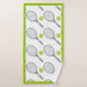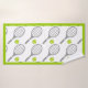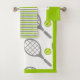 Tennis racket and ball, border and monogram bath towel set featuring a pattern of a grey racket, a green tennis ball on white background. The hand towel showcase stripes in grey, green and white while the washcloth is of green solid colour with your monogram in a frame. Some elements courtesy of vectorportal.com.