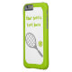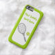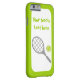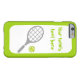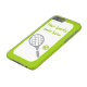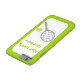 Tennis racket and ball custom iPhone 6 case. This cool design features a grey racket, a green tennis ball and your text on white background with green border. The perfect gift for the tennis player or tennis lover in your life. Some elements courtesy of vectorportal.com.