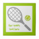 Tennis racket and ball tile that features a grey racket, a green tennis ball and your text on white background with green border. This cool design is a template and it is completely customisable. The perfect gift for the tennis player or tennis lover in your life. Some elements courtesy of vectorportal.com.