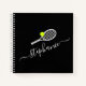 Modern fun and elegant personalised tennis theme notebook with a tennis racket and ball design with your name in a calligraphy script handwriting font on an editable colour black and white cover.