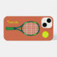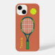 This is a colourful graphic red tennis racket and tennis ball of classic colour.