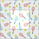 Cute fabric with illustrated tennis rackets and tennis balls pattern. White background.