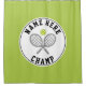 Tennis rackets and ball champ and player name green shower curtain. It showcases crossed rackets and a green ball on white with custom text around it and you can add the player name. The background of the curtain is of green solid colour