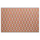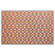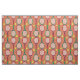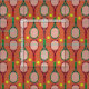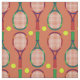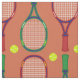 This is a colourful graphic pattern of red and green tennis rackets and tennis balls of classic colour on a terracotta background, which symbolises a clay court.