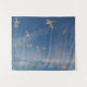 The original photograph by ZoeSPEAK on this Wall Tapestry captures a flock of terns taking off from a beach on Florida’s Gulf Coast. heading out over the ocean. The white birds, in the light of the late afternoon sun, stand out against the deep blue sky. The terns have black feathers on their heads and wing edges, and forked tails like swallow's tails.
