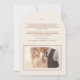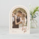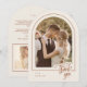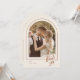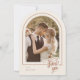 An elegant and modern earthy neutral arch-shaped wedding thank you card that features a trendy handwritten style "thank you" text and sleek borders around your photos. Shown on a neutral beige background with terracotta text and design elements. Personalise the template with your initials, wedding date, message, and photos. All text, elements, and background colours are editable so that you can create a custom card that matches your photo perfectly. © Kimbellished, LLC
