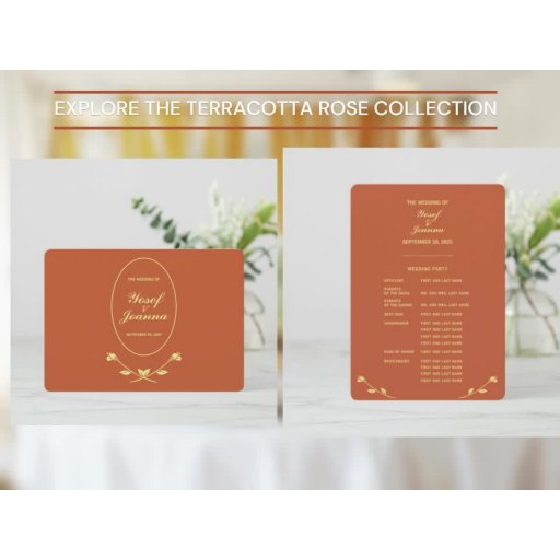 Add an elegant touch to your wedding invites with terracotta and foil wedding RSVP response cards. Real foil features a raised texture. The front features real foil "RSVP." The inside of the card has the wedding response details including three meal choices. Just change the text to fit your needs. Use the template to personalise.