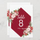 This table number card features an airy, classic layout with floral arrangements framing the top-left and bottom-right corners. The text is rendered in a rich burgundy, including a graceful script for "Table" and a bold, clear number for high visibility.
