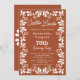 Terracotta Mexican Talavera Cielito Lindo 70th Birthday Party Invitation for Women - Celebrate her 70th birthday in style with this beautiful Mexican art Talavera inspired design for a women's 70th birthday party. With beautiful and natural brown orange terracotta barro colour and white colour palette. Script calligraphy text and classic Mexican style papel picado swirls make this a unique, cosy and festive 70th birthday milestone invite. Perfect for a Mexican Fiesta Birthday Celebration. Customise this editable 70th birthday party invitation template with your own event details. Available to order in printable format through Zazzle or instant digital download, easy to send via email, text or social media.