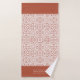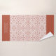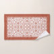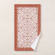 Terracotta and white damask pattern and scalloped borders Bath Towel Set. The bath towel features an elegant terracotta brown and white damask pattern and bands on the short sides with scalloped edges. There is also a frame with your family name. The hand towel showcases a scalloped border around it while the wash cloth is in terracotta colour in the centre with a damask border and your monogram. You can personalise it with your family name and monogram.