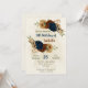 Beautiful earth tone fall birthday party invitations featuring terracotta, beige and navy blue flowers with green leaves .