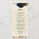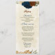 Beautiful earth tone fall wedding menu card featuring terracotta, beige and navy blue flowers with green leaves .