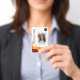 Please note that the background colour, fonts, and sizes of text can be changed. You can upload a QR code, or a bar code, or add any other info on the backside.
