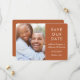 A simple modern design to announce your wedding date features your favourite photo with a classic white typography for all of your important details. The front and reverse side are terracotta