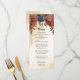 Beautiful earth tone fall wedding menu card featuring terracotta and navy blue flowers with green leaves . The gold glitter details are simulated.