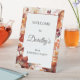 Elegant terracotta orange watercolor flowers create a bold floral frame on this fall floral birthday party welcome sign. An elegant script gives it a classic vibe.