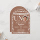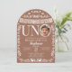 Celebrate your little one turning ONE with this elegant terracotta “UNO” photo birthday invitation. Inspired by traditional Mexican papel picado décor, this design features delicate white banner details and ornamental flourishes set against a warm terracotta background.