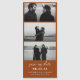 This save-the-date card features a vertical photo strip design with three black-and-white images of a couple in outdoor settings, creating a timeless and romantic feel. The lower section is minimalist, with a clean white background showcasing elegant handwritten-style script paired with bold sans-serif typography, enhancing the modern yet classic aesthetic.
