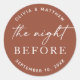 Warm and earthy, this elegant terracotta round sticker featuring the phrase “The Night Before” is perfect for boho, rustic, or fall themed weddings. The rich clay orange background adds a cosy, modern touch to your rehearsal dinner decor. Use this versatile sticker to seal envelopes, decorate favour bags, or personalise welcome gifts. Ideal for couples embracing warm tones, desert inspired palettes, or outdoor autumn wedding celebrations.