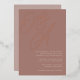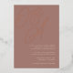 A beautiful typography based monogram wedding invitation featuring your initials in oversized rose gold foil script lettering at the top, in tone on tone shades for a watermark effect. Personalize with your wedding details in classic serif lettering aligned at the lower right. Our Terracotta colorway is an elegant mix of earthy neutrals, featuring warm white rosy taupe lettering on a terracotta clay background.