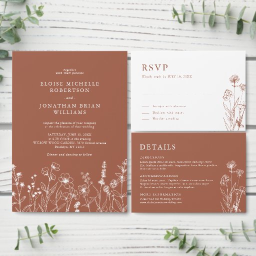Invite your loved ones in style with this elegant terracotta floral wedding invitation with details on back. Featuring hand-drawn wildflowers in warm autumn tones, this rustic yet romantic design sets the perfect tone for a fall garden wedding. Customise with your names, wedding details, and fonts to make it truly yours. Ideal for outdoor, boho, country, or botanical-themed weddings.