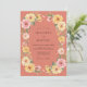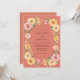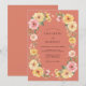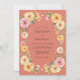 This design features a warm, earthy terracotta background that sets a vibrant tone for a seasonal event. A lush arrangement of watercolor florals, including golden yellow roses, soft pink blossoms, and delicate greenery, accents the composition. The palette of coral, amber, and blush creates a cheerful and romantic mood perfect for an outdoor or desert ceremony. Hand-painted botanical details lend an artistic, high-quality feel to the overall aesthetic.