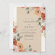 This design features a warm palette of terracotta, rust, and soft peach tones. Delicate watercolor roses and ranunculus are paired with sage green eucalyptus leaves for an earthy, organic aesthetic. Subtle gold accents add a touch of sophistication to the muted tan background. The overall mood is romantic and perfect for an autumnal or desert-themed event.