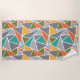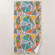 This beach towel has a mid-century modern design of triangles making a terrazzo floor look, in greys, turquoise, orange, gold, and green.