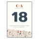 An on-trend terrazzo stone detail and mid-century inspired typography give this wedding table number a warm and modern vibe in a desert inspired colour palette of rust, blush and slate blue all topped off with a modern monogram.