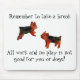 For dog lovers with a reminder to take a break and two brown Terrier dogs waiting to play. The dogs are from my original glass painting and the"'all work no play" quote can be customized. ©Annabel Potter