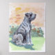 Watercolour painting of a grey terrier type dog sitting on the grass. Dog is pictured in front of a wall.
