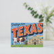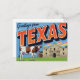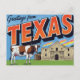 Remember the Alamo with this classic retro "Greetings from Texas" postcard! This bold, large-letter design features two of the Lone Star State's most recognizable symbols: the historic Alamo and a characteristic longhorn cow. The vintage artwork captures the spirit of Texas history and ranching heritage. Perfect for residents, tourists, history buffs, cattle enthusiasts, and collectors of Americana state souvenirs and Western travel art.