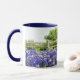 This cool mug features my original photograph of a hillside in the Hill Country of Texas bluebonnet flowers along a country wooden fence, processed into an artsy illustrated style. The handle and inside of the cup are dark blue to complement the artwork.