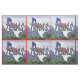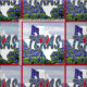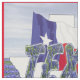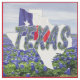 Texas state outline with Texas flag and Texas letters cutout in bluebonnets on a background of bluebonnets and blue sky printed on fabric.