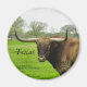 Longhorn Texas round magnet. Burnt orange Longhorn against green hill. Original photograph by Cherie Haines.