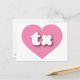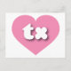 This postcard features a calm, cool pink heart containing the bold, white, rounded lower case letters tx, a playful abbreviation for Texas, the lone star state. The reverse side of the postcard is blank, awaiting your personalised text or handwritten sentiments.